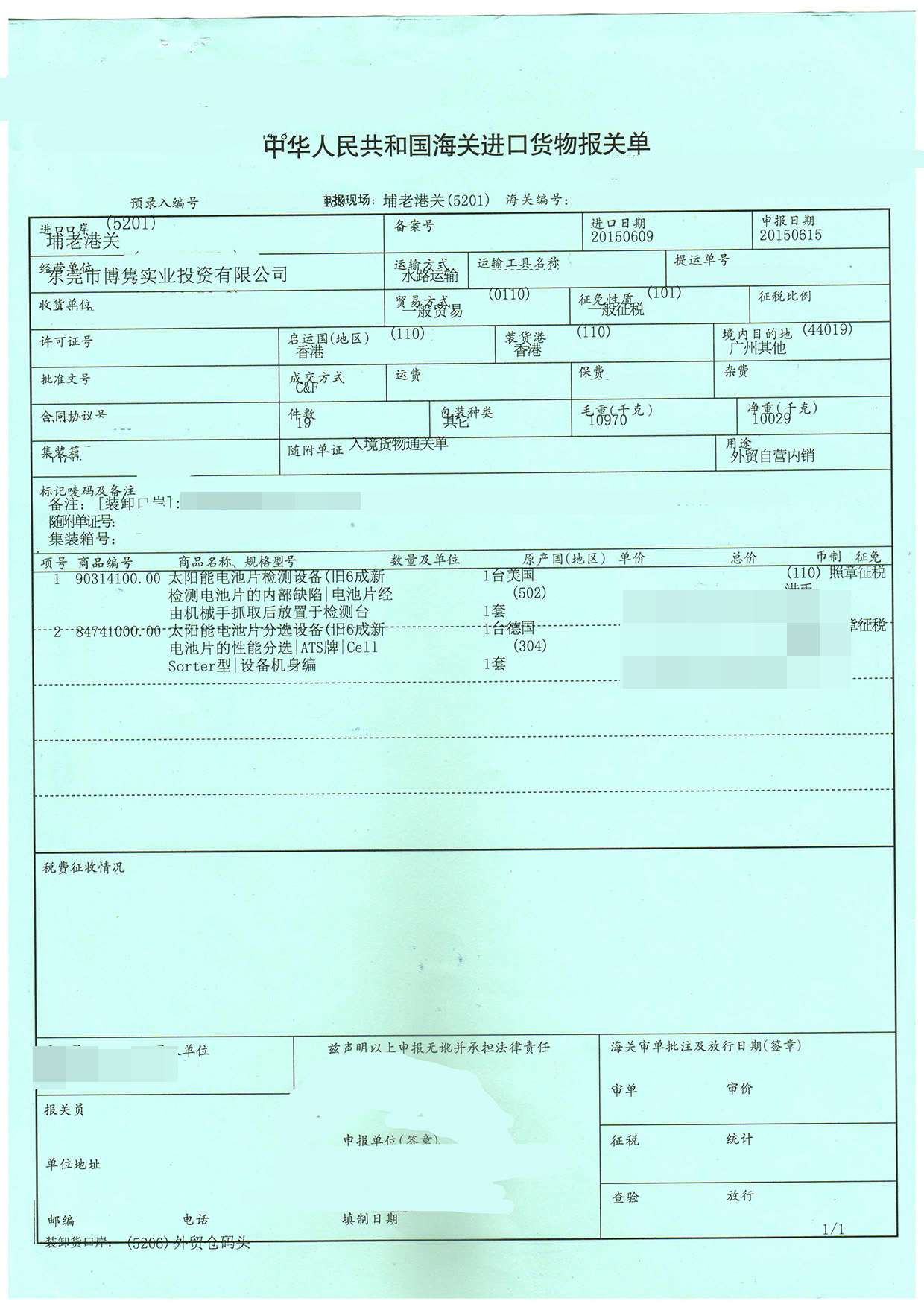 操作貨物:太陽能電池片檢測設備(舊6成新)、太陽能電池片分選設備(舊6成新)
