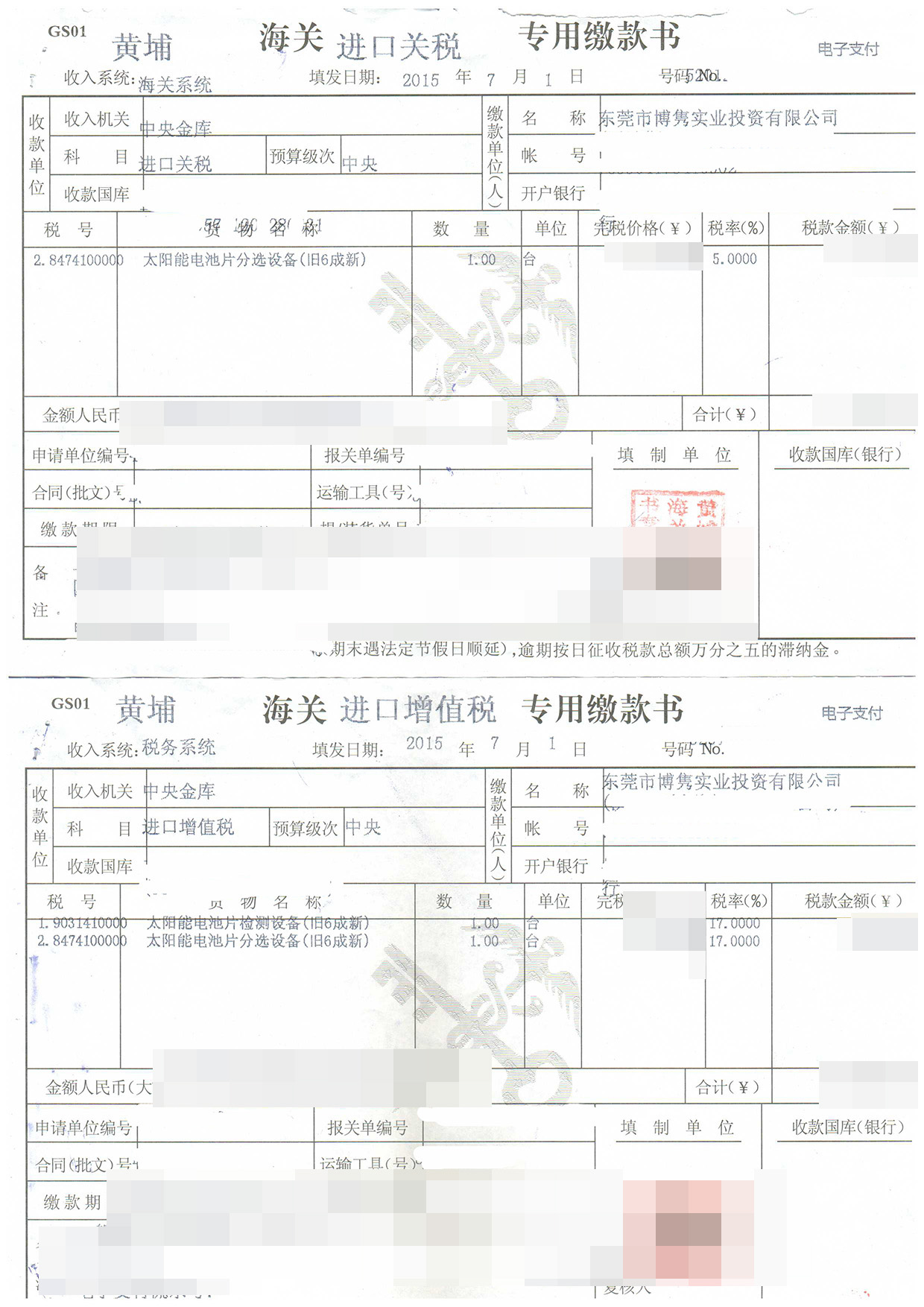 關稅:太陽能電池片分選設備(舊6成新)(5%)