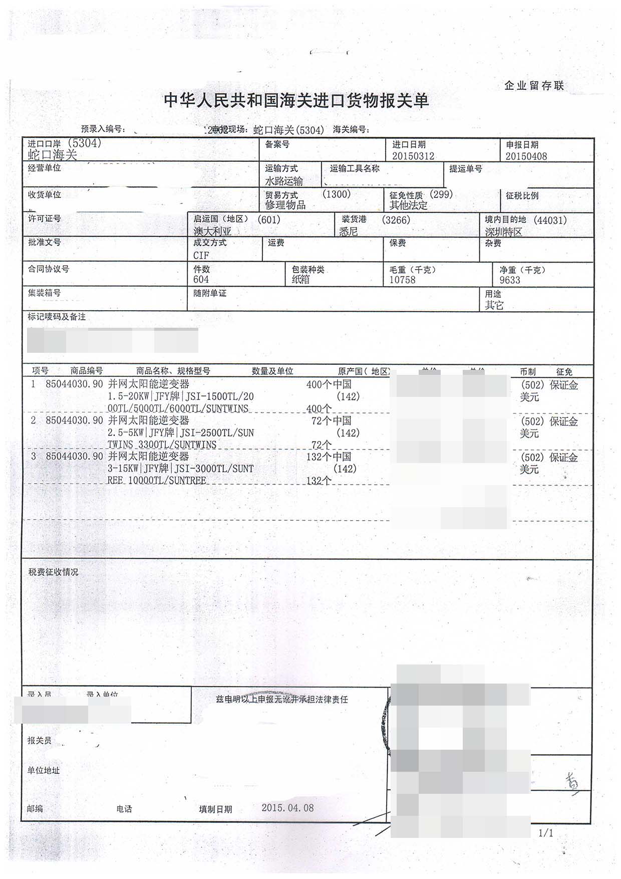 【文章標題】:并網太陽能逆變器進口報關案例 http://www.sw20000.com.cn/lm5/52.html 轉載請注明出處