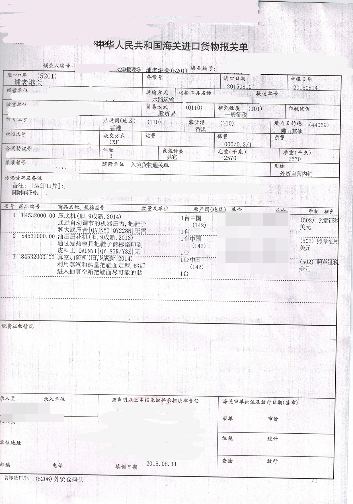 目前制鞋機械中有一種撓性壓底機,其主要包含有至少一個加壓槽,所述加壓槽具有一開口,所述開口處設有一可蓋合的上蓋,且所述加壓槽內部由一撓性片分隔成一施壓空間和一液壓空間;所述施壓空間內可供置入待處理鞋材,再在所述液壓空間內逐漸充填具有壓力的液體,借由液體的壓力使撓性片直接或間接包覆于鞋材外表面,以利于對鞋材表面壓合幫助鞋材緊密貼合。我司擁有豐富的壓底機進口報關手續流程及案例,現在為大家詳細介紹一下關于壓底機進口報關那些事兒!