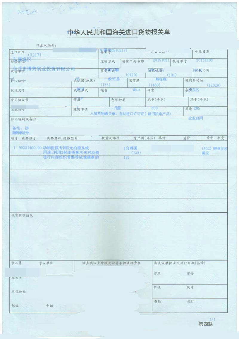x光機是產生X光的設備,其主要由X光球管和X光機電源以及控制電路等組成,而X光球管又由陰極燈絲(Cathod)和陽極靶(Anode)以及真空玻璃管組成,X光機電源又可分為高壓電源和燈絲電源兩部分,其中燈絲電源用于為燈絲加熱,高壓電源的高壓輸出端分別夾在陰極燈絲和陽極靶兩端,提供一個高壓電場使燈絲上活躍的電子加速流向陽極靶,形成一個高速的電子流,轟擊陽極靶面后,99%轉化為熱量,1%由于軔致輻射產生X射線。我司擁有豐富的動物醫院用設備進口報關手續流程及案例,現在為大家詳細介紹一下關于動物醫院用設備進口報關那些事兒!