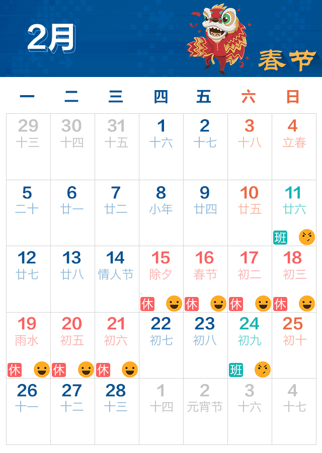我司2018年春節假期由2月15日(除夕)至2月21日(年初六),共七天,2月22日星期四(年初七)正式上班,2.11日星期日、2月24日星期六補班一天。