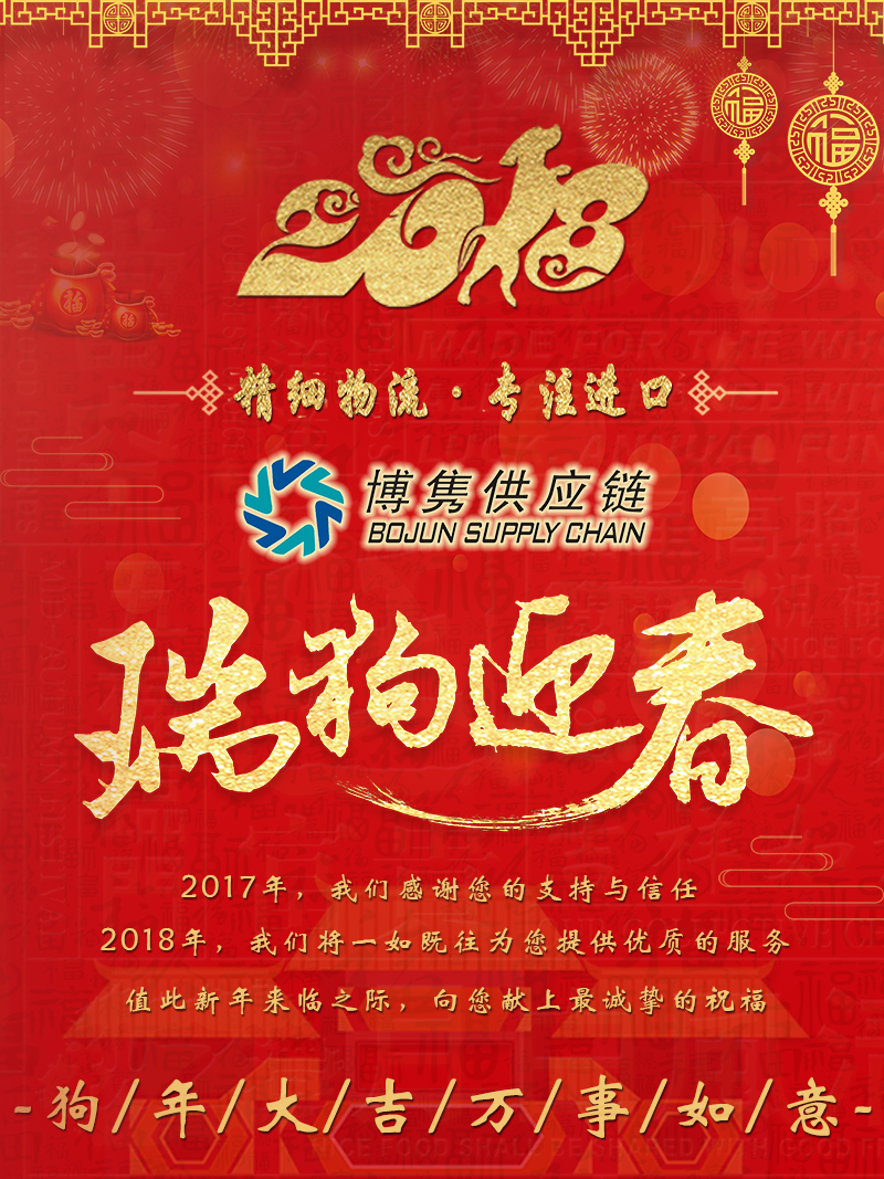 博裕機械進口報關&博雋進口作為一站式進口報關供應商,多年來我們一直堅持“精細物流,專注進口”的公司理念。以專業的進口操作方案、持優質的服務,與業界一起書寫精彩篇章。值此佳節之際,博裕&博雋進口向業界致以美好的祝愿,祝大家在新的一年里:事業興旺、和氣致祥、身體健康、家庭康泰,萬事如意!