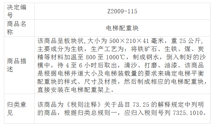 不論是卷揚機驅(qū)動的強制驅(qū)動電梯,還是曳引機驅(qū)動的曳引驅(qū)動電梯,一般都會配有平衡(配重)塊,用以降低主電機的牽引力和功率,節(jié)省費用和能量。但不應想當然地將平衡塊按電梯零件歸入品目84.31,見73.25品目注釋及歸類決定Z2009-115: